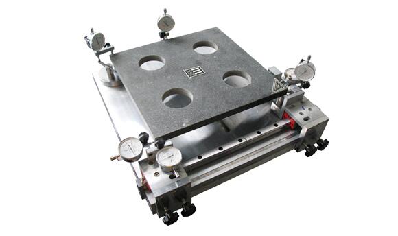 本儀器由支承平板、可移動的左支座和右支座組成一個直角坐標系。在平板上有三個等高支承銷與陶瓷面磚類似外形和具有理想尺寸的標準板進行探測,并將儀表值調(diào)整至適當位置,并記下該示值。然后,以被測陶瓷面磚取代標準板,在不移動測量點的情況下,分別測出六項指標參數(shù)。左、右支座及中心測量支座可在平板上作平行移動,組成不同位置的空間座標,以適應(yīng)不同規(guī)格尺寸陶瓷面磚的測定。